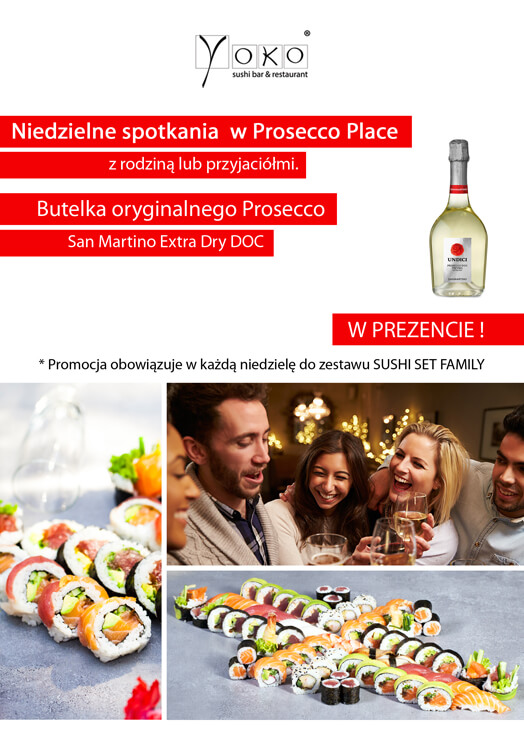 Wiemy, że udana niedziela to taka w gronie najbliższych. Mamy nadzieję, że butelka oryginalnego Prosecco San Martino Extra Dry DOC w prezencie od Yoko Restaurant (Klif Dom Mody) umili ten wyjątkowy czas. Wybierając nasz najpiękniejszy i najbardziej barwny zestaw SUSHI SET FAMILY wierzymy, że spędzicie ze sobą miło czas w towarzystwie przyjemnych bąbelków Prosecco. Do zobaczenia w KLIF - DOM MODY !!